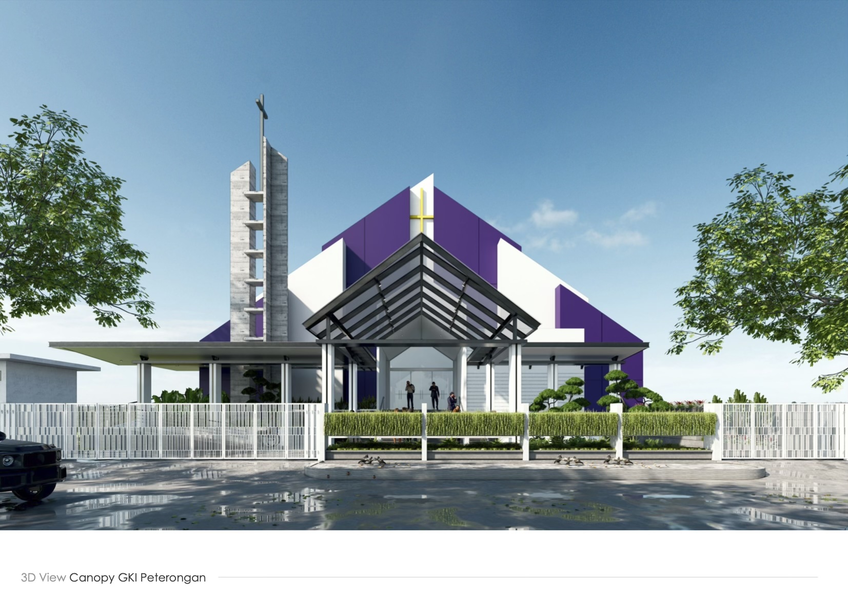 Desain arsitektur baru mengusung konsep kontemporer dengan fasad ungu dan putih yang ikonik, canopy kaca modern, taman hijau, serta interior yang hangat dan fungsional — menciptakan ruang yang inspiratif bagi peribadatan dan pelayanan.